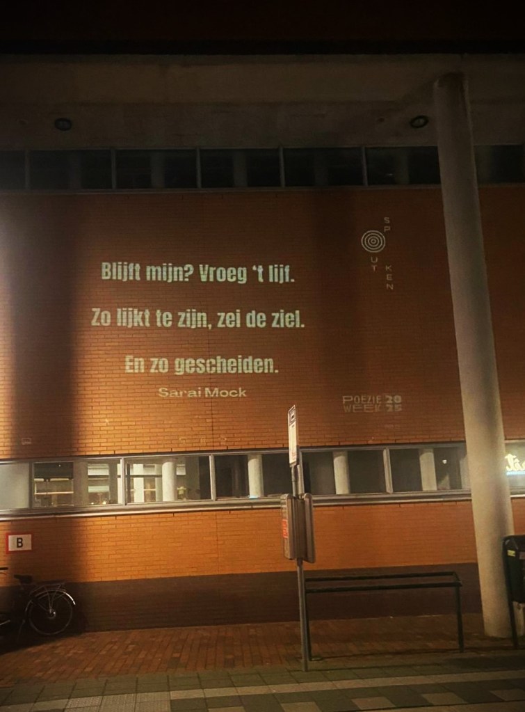 Projection of my poem during the Dutch Poetry Week in public spaces in Hilversum, such as this building next to a busstop.